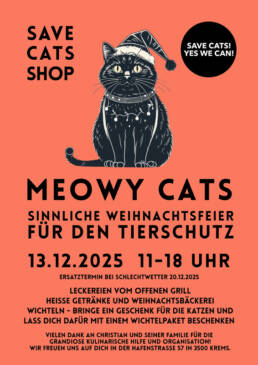 Der Save Cats Shop hat (Feiertage ausgenommen) Freitag von 14-18 Uhr und Samstag von 9-15 Uhr geöffnet. Alle Einnahmen gehen zum Tierschutz und in die Pflege und Versorgung unserer Tiere.